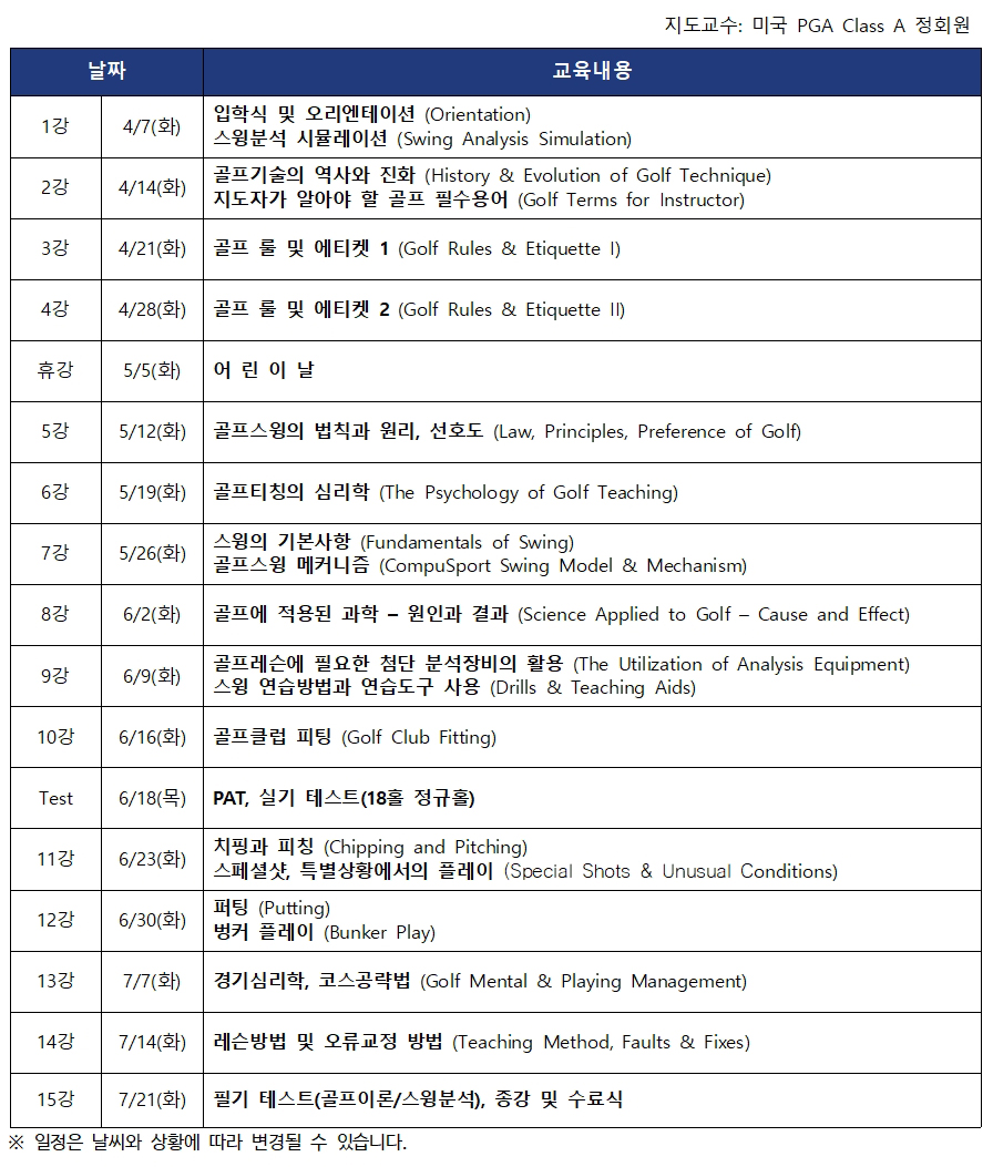 이 15주 교육과정은 문화체육관광부의 정식 인가를 받아 골프분야에서 티칭 전문인력을 교육하고 양성하는데 목표를 두고 있습니다. 특히 이미 골프실력을 인정받는 민간인 골퍼들에게 레슨을 할 만한 충분한 지식교육을 실시하여 자격시험과 검정을 통해 골프티칭라이센스를 부여함으로써 골프 티칭 전문가로서 할동할 수 있도록 하는데 목적이 있습니다.