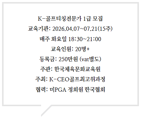 K-골프티칭 전문가과정 1급 모집요강 | 기간 및 날짜 | 2026년 04월 07일~2026년 07월 21일(15강) |
